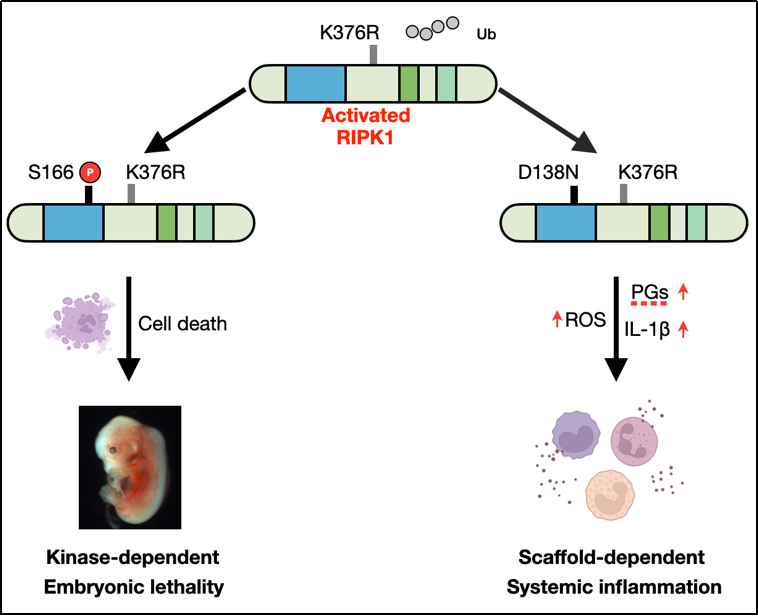 章海兵研究组长期致力于程序性细胞死亡及其在炎症调控中的机制研究。前期工作通过构建Ripk1K376R突变小鼠模型,阐明了RIPK1 K376位点泛素化通过抑制细胞凋亡和程序性坏死,在维持个体发育中发挥关键作用(Nat Commun.2019.PMID: 31519886)。在此基础上,该研究进一步构建了Ripk1K376R/D138N等双点突变小鼠模型,发现K376位点泛素化缺失会导致RIPK1异常激活:在胚胎期通过激酶依赖性途径诱导过度细胞死亡,引发胚胎致死;而在引入激酶失活突变(D138N)后,虽能挽救胚胎致死,但小鼠仍表现出进行性系统性炎症,包括皮肤和肝脏炎症、脾脏肿大以及免疫稳态失调。