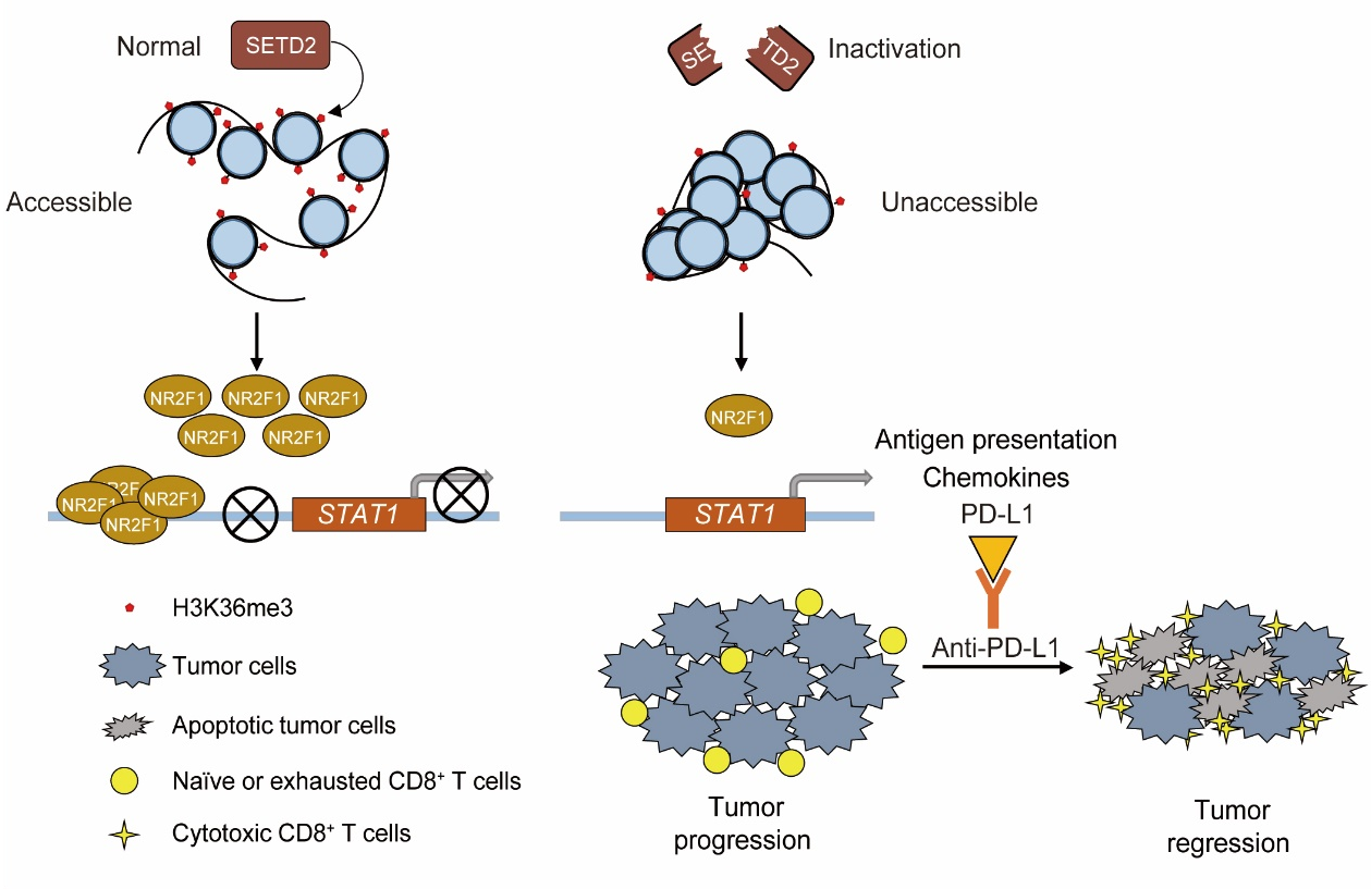 (左):SETD2正常发挥作用,染色质开放性强,NR2F1表达水平高,抑制STAT1转录激活。(右):SETD2失活时染色质开放性差,NR2F1表达水平低,STAT1转录增强。重塑肿瘤免疫微环境,增强肿瘤细胞对免疫检查点阻断治疗的敏感性。