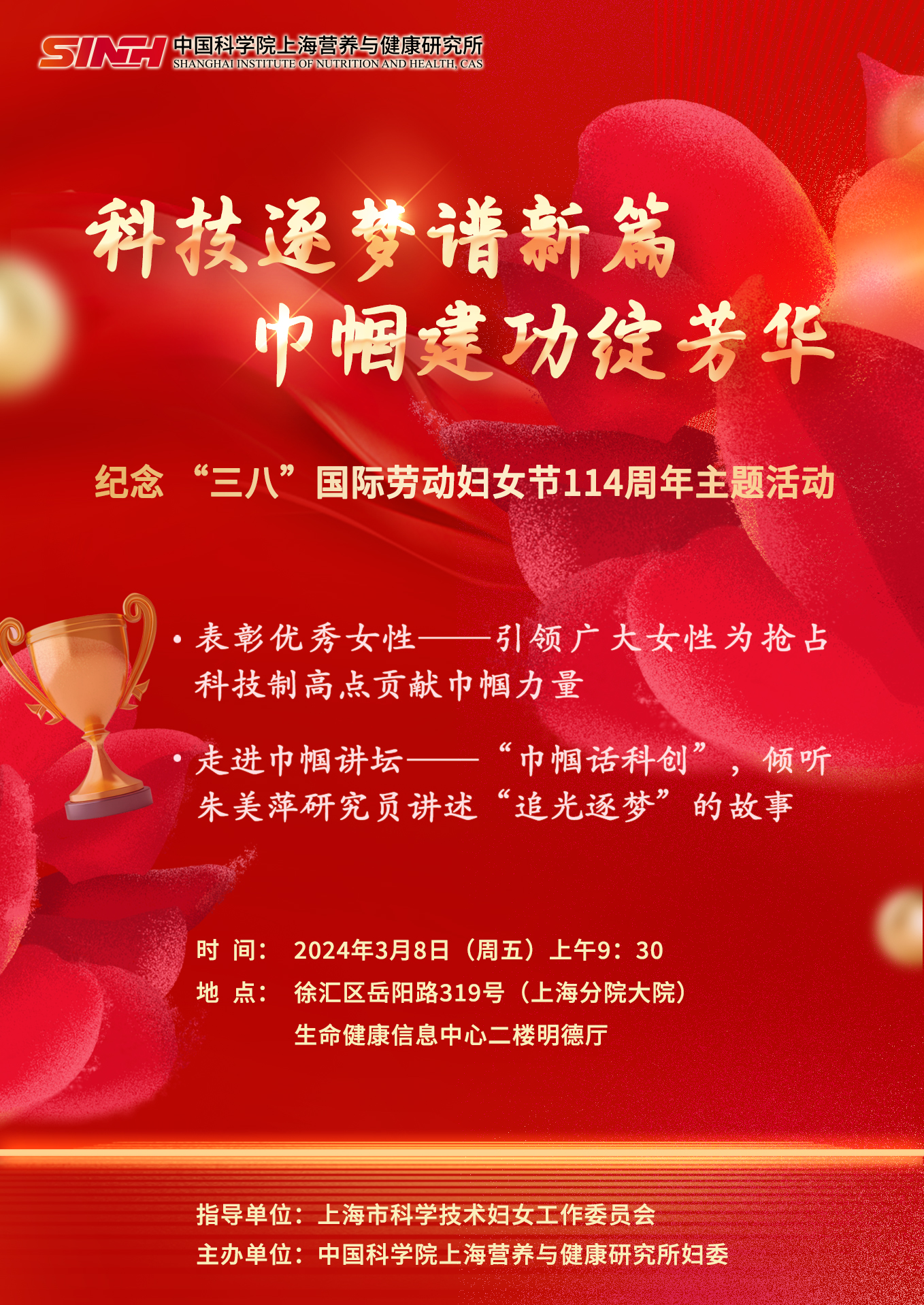 此外欢迎全所及各兄弟单位女性同胞于3月8日当天,参加“科技逐梦谱新篇?巾帼建功绽芳华”营养与健康所纪念国际劳动妇女节114周年主题活动。