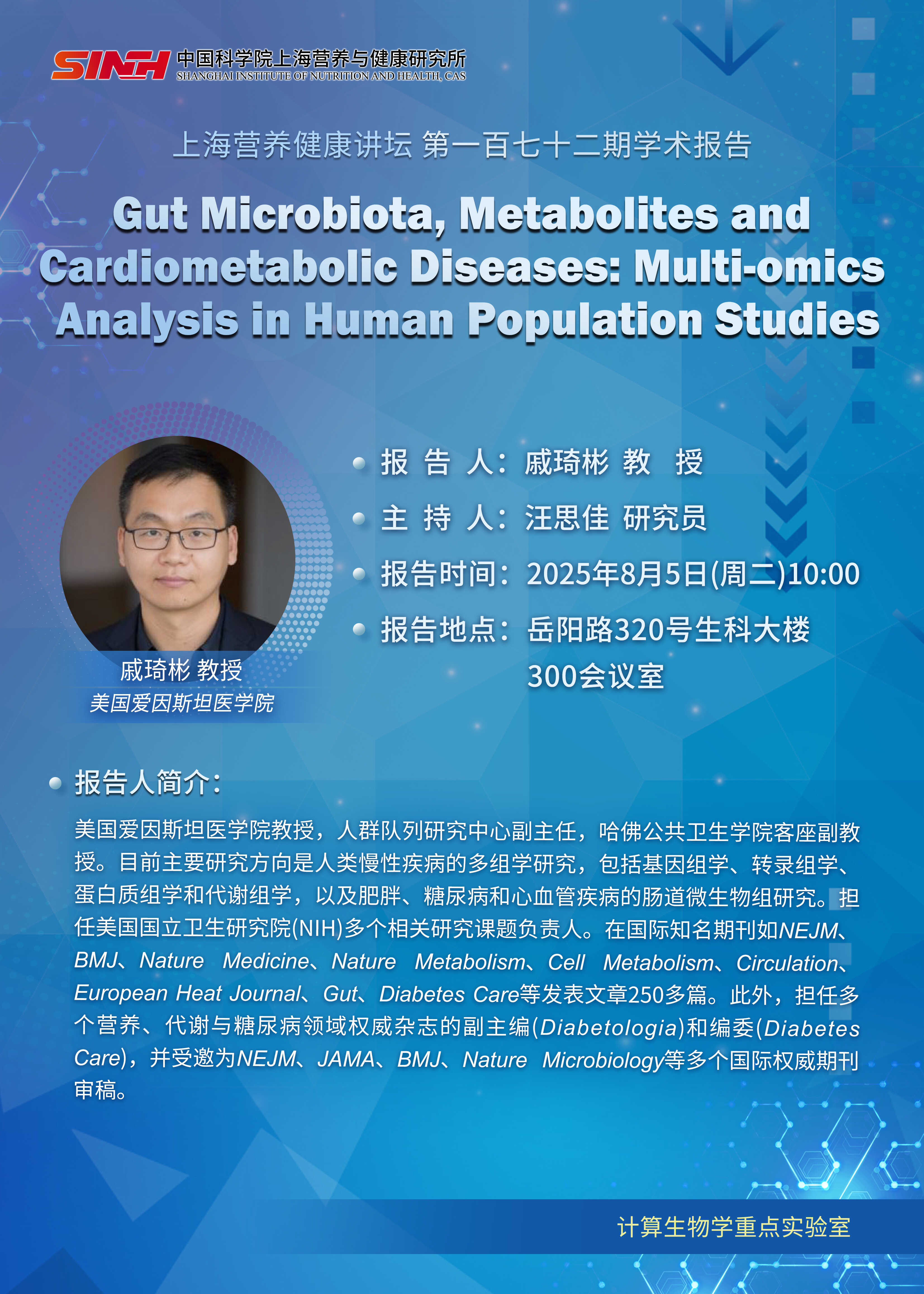 8月5日|Gut Microbiota, Metabolites and Cardiometabolic Diseases:?Multi-omics Analysis in Human Population Studies-上海营养健康讲坛