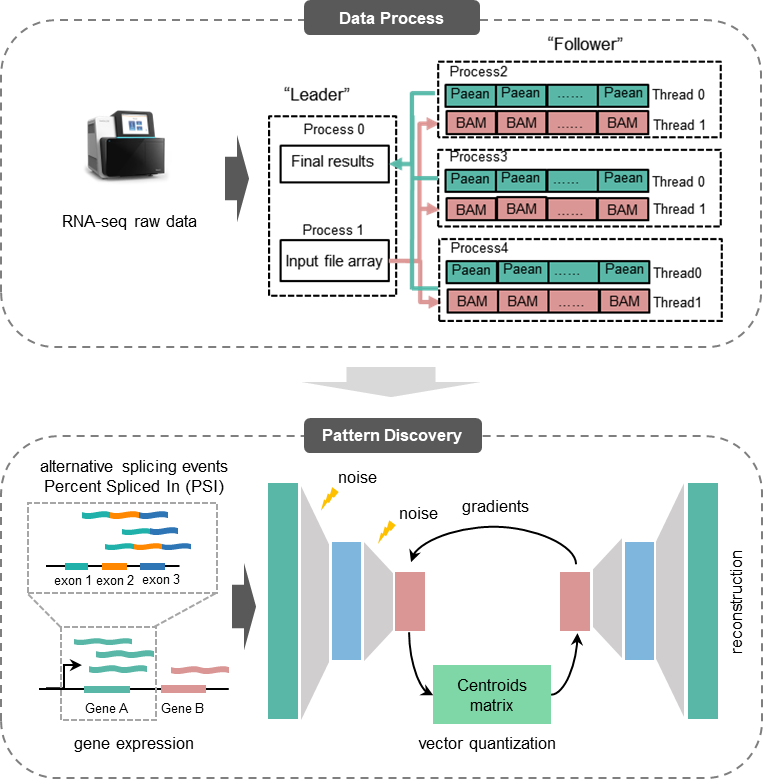 AI4Life团队使用基于异构计算的转录组定量算法Paean对癌症样本中基因表达和可变剪接事件进行定量,Paean分析单个样本的时间在20秒左右,在多卡条件下可以在1天的时间内完成万级别癌症样本的转录组分析工作。为了探索复杂疾病分子机理,AI4Life团队基于自编码器(Autoencoder)与向量量化(vector quantization)的算法设计了通用无监督学习模型DAO(Deep AutOencoder Clustering)。AI4Life团队使用DAO模型对样本量近一万、特征维度超过七万的泛癌转录组数据集进行了聚类分析,基于转录组特征提出了潜在泛癌分类系统,发现了癌症不同亚型之间病理特征、分子机制等表型存在诸多差异,并在独立数据集上验证了关键结论。