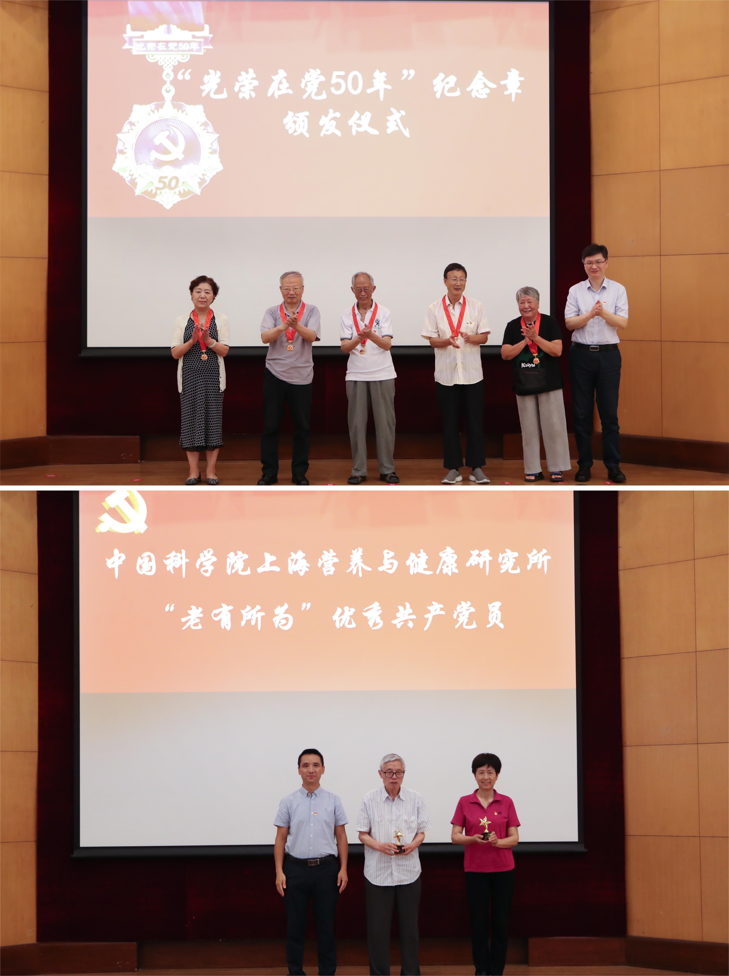 党委书记瞿荣辉向5位老同志颁发了“光荣在党50年”纪念章,胡国宏为研究所2位 “老有所为”优秀共产党员颁奖。全场用热烈的掌声向受表彰党员致以祝贺。