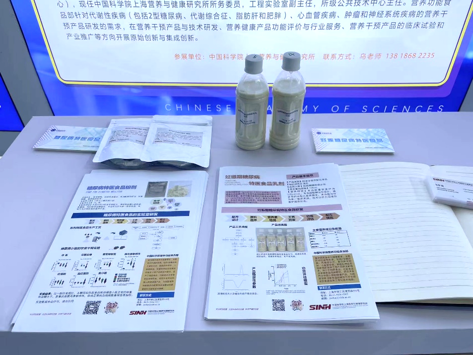 特医食品全称是特殊医学用途配方食品(FSMP),是指为满足进食受限、消化吸收障碍、代谢紊乱或特定疾病状态人群对营养素或者膳食的特殊需要,专门加工配制而成的配方食品。本次参展的两款展品:一款是糖尿病特医食品试制品(粉剂),为低GI的全营养配方,以满足高血糖人群的营养需求,维持血糖稳态;另一款是妊娠糖尿病特医食品试制品(乳剂),专为妊娠期妇女设计,以满足孕妇及胎儿营养需求,同时维持血糖稳态。这两款试样成果经营养功能食品部多年研发,已在营养功能食品部完成了营养素配方设计和加工工艺设计,并经过工艺混合均匀度验证和产品货架期稳定性测试。通过动物实验证明其能维持模型小鼠正常的体重和血糖水平,及正常的血细胞数量等营养指标,并能够显著改善模型小鼠的胰岛素敏感性。