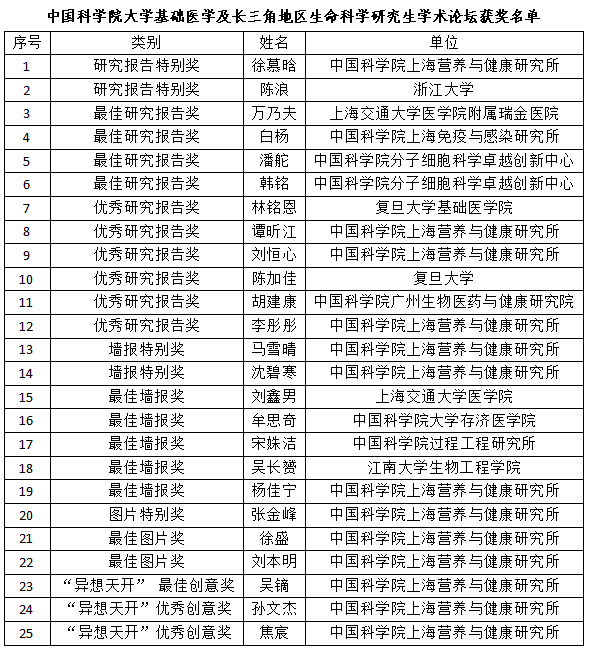 经评审,最终评选出口头报告类奖项15名、墙报类奖项7名、科研图片类奖项3名。其中,营养与健康所徐慕晗同学的《嗜中性粒细胞塑造脾脏微环境抑制T细胞抗乳腺癌免疫应答》和浙江大学陈浪同学的《Receptor-interacting protein kinase 2 as an immunotherapy target in pancreatic cancer》获研究报告特别奖;营养与健康所马雪晴同学的《合成生物学产业发展现状与企业专利布局》和沈碧寒同学的《A systematic assessment of deep learning methods for drug response prediction: from in vitro to clinical applications》获墙报特别奖。